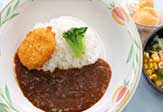ハヤシソース・ごはん・野菜コロッケ・ブロッコリー・マカロニサラダ・プチシュークリーム