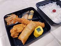 唐揚げ・エビフライ・春巻き・焼魚・山芋短冊揚げ・切干大根・卵ロール・ごはん・小梅