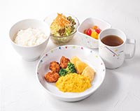 ごはん、野菜スープ、ポテト、おからとこんにゃくの唐揚げ、豆乳加工品を使ったスクランブルエッグ風、ブロッコリー、コーンサラダ、フルーツカクテル